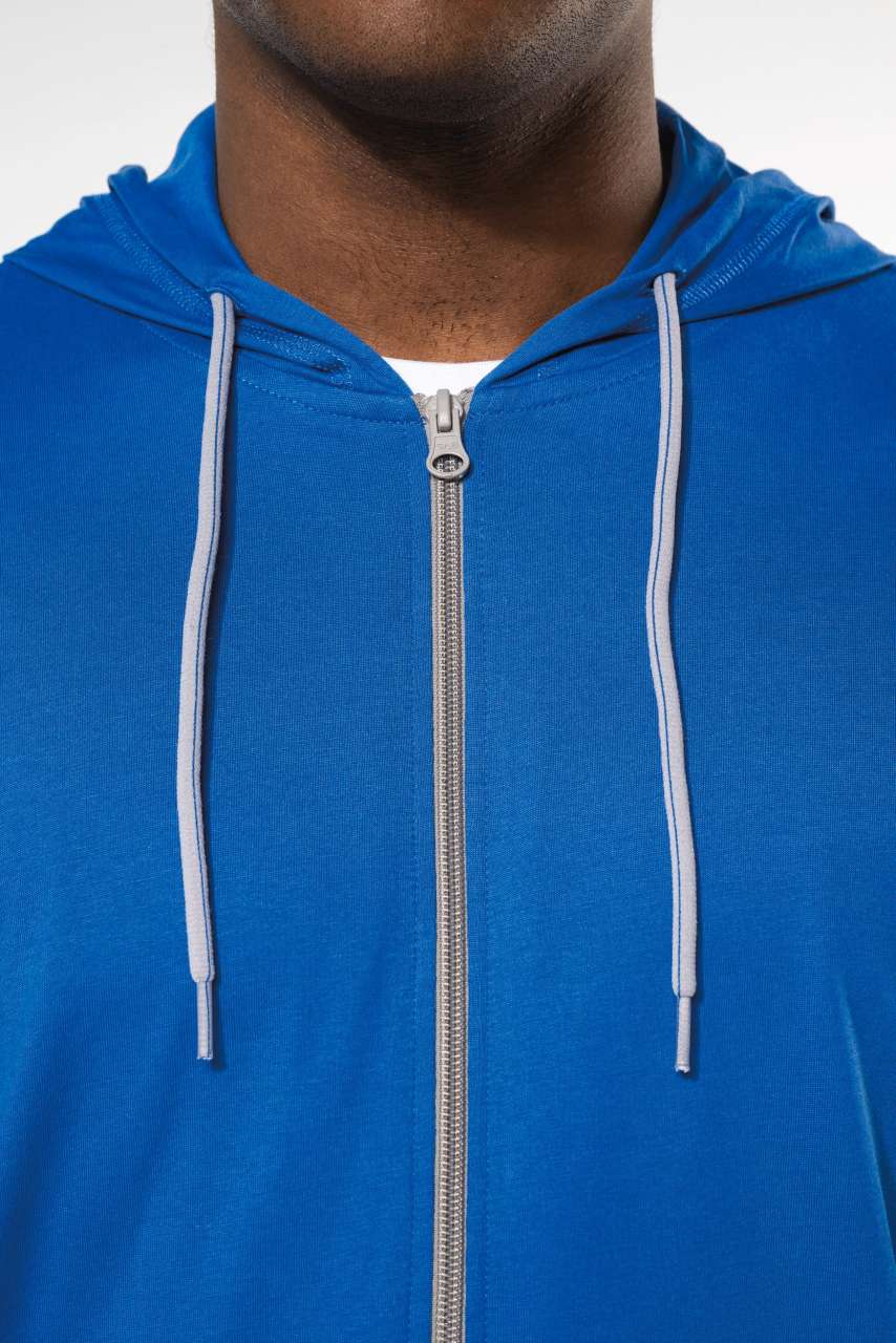 - Contrasting zip and two-tone drawstring hood